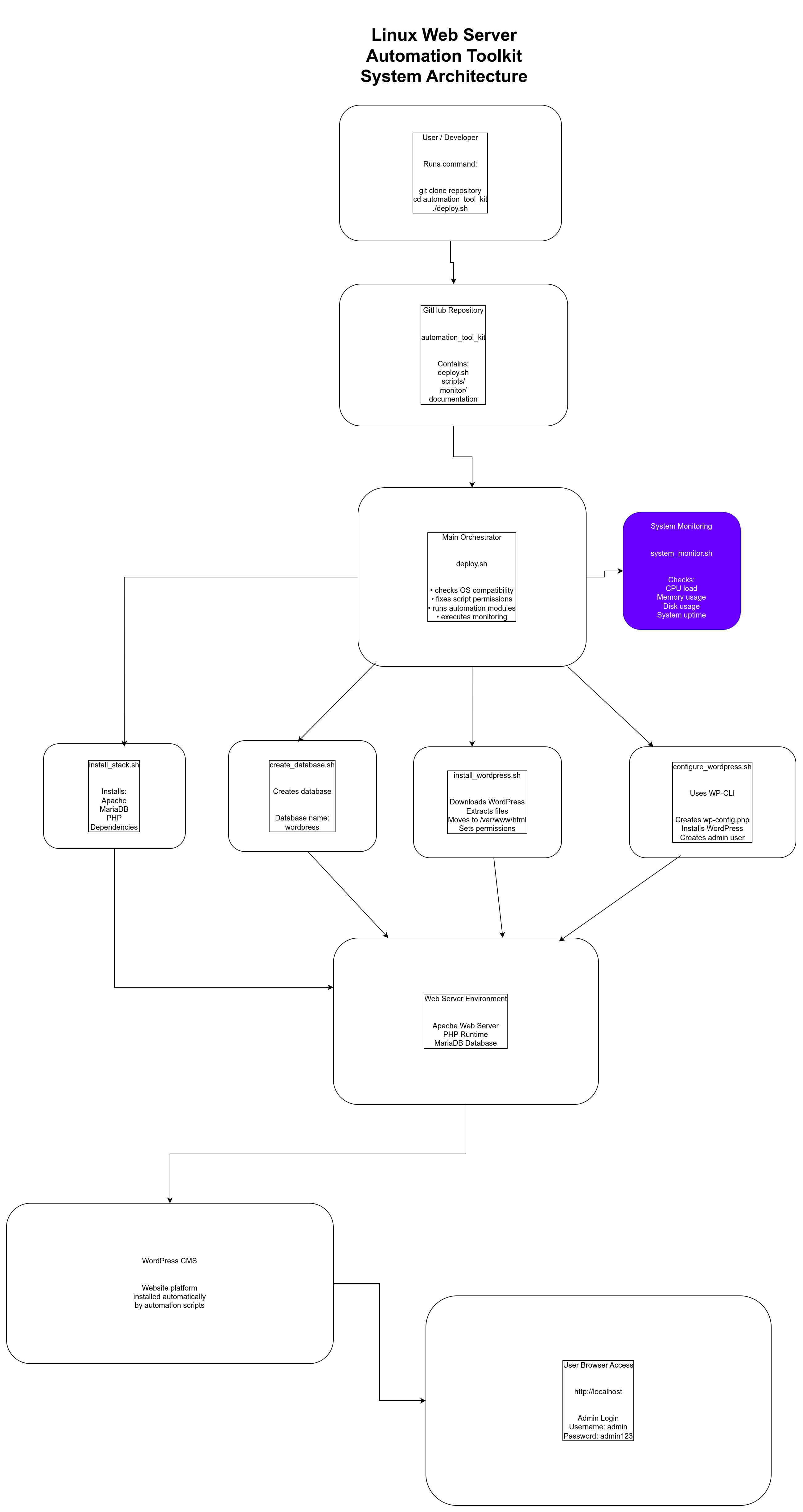 The solution is a Bash automation toolkit that installs and configures the full web stack automatically. The scripts install Apache, MariaDB, PHP and WordPress while also performing system checks and monitoring.